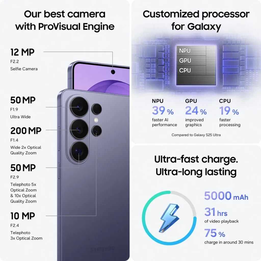 Samsung has doubled down on optics. The quad-camera setup includes a primary 200 MP wide camera with an impressive f/1.4 aperture for stunning low-light photography. It is paired with a dual-telephoto system (two 10MP lenses offering 3x optical zoom) and a massive 50MP ultrawide lens with a 120˚ field of view.